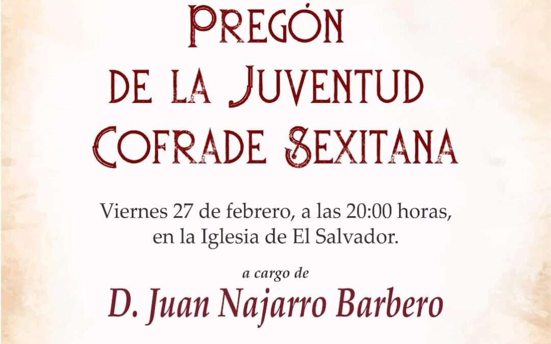 La Agrupación de Cofradías y Hermandades de Semana Santa de Almuñécar tuvo a bien designar como pregonero de la Juventud Cofrade Sexitana para 2026 al hermano de nuestra cofradía Juan Najarro Barbero, pregón que se celebrará el próximo viernes 27 de febrero de 2026, a las 20:00 horas en el Templo El Salvador.
